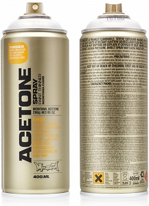 Technical Montana Sprays: Acetone Spray: can be used as CAP CLEANER - put used nozzles on the ACETONE CAN and clean by spraying. ACETONE spray is a universal thinner and cleaning agent that is transparent in color. Removes residues of paint, lacquer, silicone, wax, tar, de-greasing. Suitable for pre-treatment before painting objects or to remove paint residues after painting.