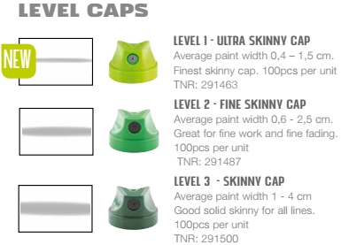 CHOOSE YOUR SPRAY WIDTH Average spray width will vary depending on the technique of the user. For skinnier lines, spray from a closer distance. For fatter lines, spray from a further distance. The Montana Level Caps were precisely developed for the low pressure system allowing the most even and clean lines with the highest efficiency and accuracy. Spray widths from 0,4cm up to 25cm can be achieved depending on the users skill and experience. For perfect results we recommend the Level Cap System in combination with Montana GOLD. |