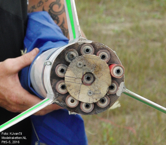 | Het clusteren kan natuurlijk ook wat extremer en een beste uitdaging vormen. Hieronder een 11-cluster met 18mm motoren. Bij de eerste twee starts, lukte het niet om alle motoren te laten ontbranden. Maar, 9 van de 11 is ook niet slecht... |