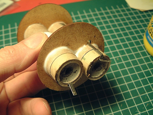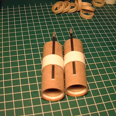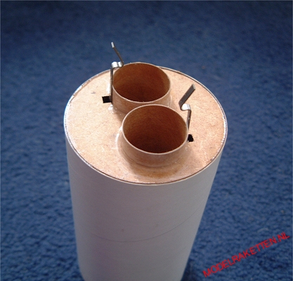 2-Cluster Het plaatsen van een cluster van 2 motoren in een modelraket. Uiteraard moet de ruimte tussen de motorhuizen en de rompbuis wel afgesloten worden. Anders gaat de overdruk van de uitdrijflading verloren door deze openingen en wordt het bergingssysteem niet uit het model geblazen. Hier maak je centreerringen met twee gaten erin, één voor elk motorhuis. |