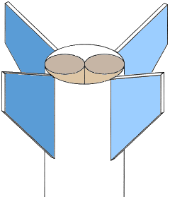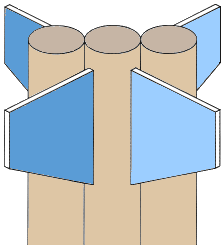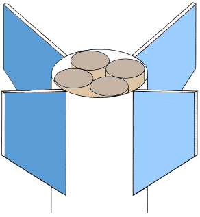 3-Cluster radiaal Het plaatsen van een cluster van 3 motoren in een modelraket. Op de tekening hiernaast zijn de motoren radiaal opgesteld ten opzichte van de centrale verticale as van het model. Dit is de meest ideale opstelling van de motoren omdat ze alle drie zo dicht mogelijk bij de centrale as geplaatst zijn. |