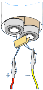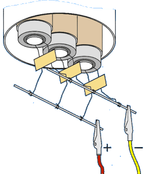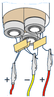 Aansluiten ontbranders Als de motoren ver uiteen liggen kan gebruik worden gemaakt van een plus en een min hoofddraad. Let wel op een goed contact. Omdat het niet ontbranden van één van de buitenste motoren een groter negatief effect heeft dan bij de radiale opstelling, is hier een zorgzame voorbereiding van nog groter belang. |