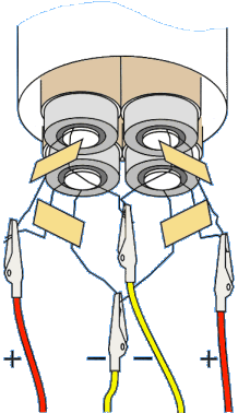 Aansluiten ontbranders Aansluiten van een cluster van 4. Let op de twee extra clips. Hier kun je twee plus- en twee mindraden gebruiken. De rechterkant van iedere ontbrander kun je verbinden met de linkerkant van de ernaast gelegen ontbrander, totdat je het kringetje rond bent. Draai de draden in elkaar, zodat er goed contact ontstaat. |